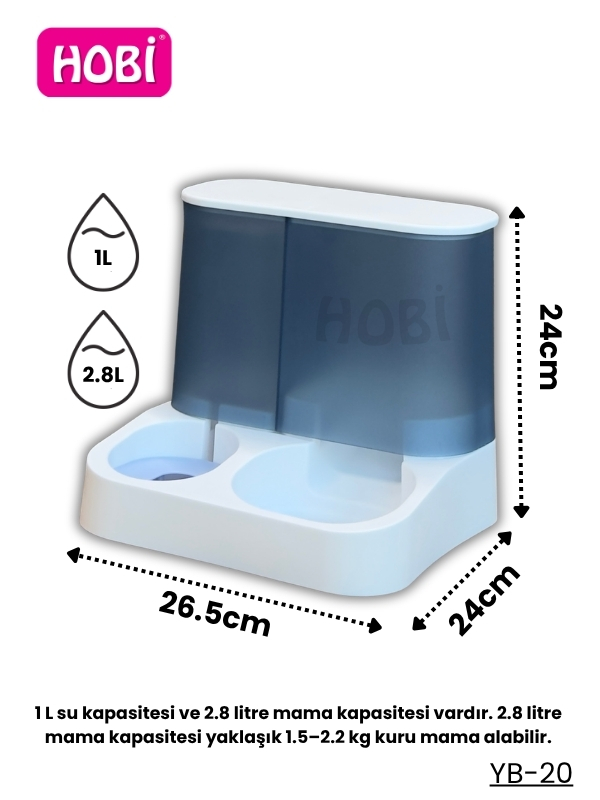 Evcil dostlarınızın günlük beslenme ve su ihtiyacını pratik ve düzenli şekilde karşılamak için tasarlanan Hobi YB-20, tek gövdede mama ve su çözümü sunar. Mavi şeffaf hazne tasarımı sayesinde hem şık bir görünüm sunar hem de doluluk oranını kolayca takip etmenizi sağlar.