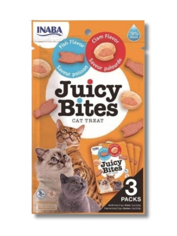 Her ısırıkta tazelik, her pakette mutluluk!INABA Juicy Bites, kedinizin bayılacağı yumuşak, balık ve istiridye aromalı ödül parçacıklarıyla lezzet ve sağlığı bir araya getirir. Doğal aromalar, yeşil çay özü ve E vitamini ile zenginleştirilen bu özel tarif, kedinizin bağışıklığını desteklerken aynı zamanda iştahını da artırır. Her paket, maksimum tazeliği koruyan üç ayrı mini ambalajdan oluşur.