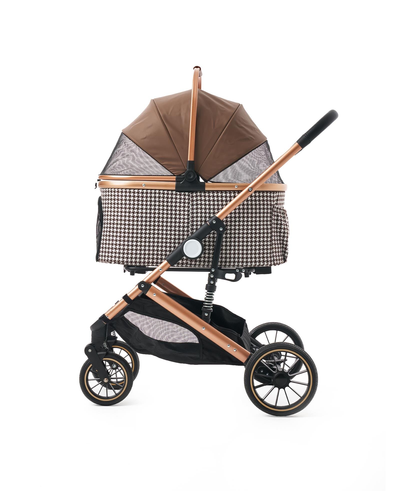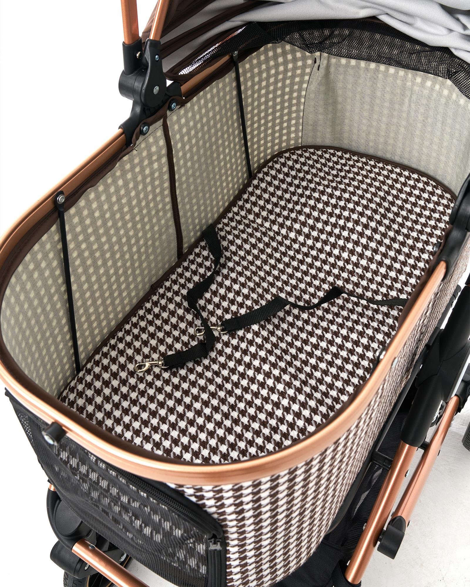 Zamansız kazayağı deseni, rose gold gövde detayları ve geniş iç hacmiyle Zampa Vector Kedi & Köpek Arabası, klasik tarzı modern konforla buluşturur. Premium tasarımı ve güçlü yapısıyla patili dostunuz için birinci sınıf bir seyahat deneyimi sunarken, stil sahibi sahipler için de fark yaratan bir görünüm sağlar.
